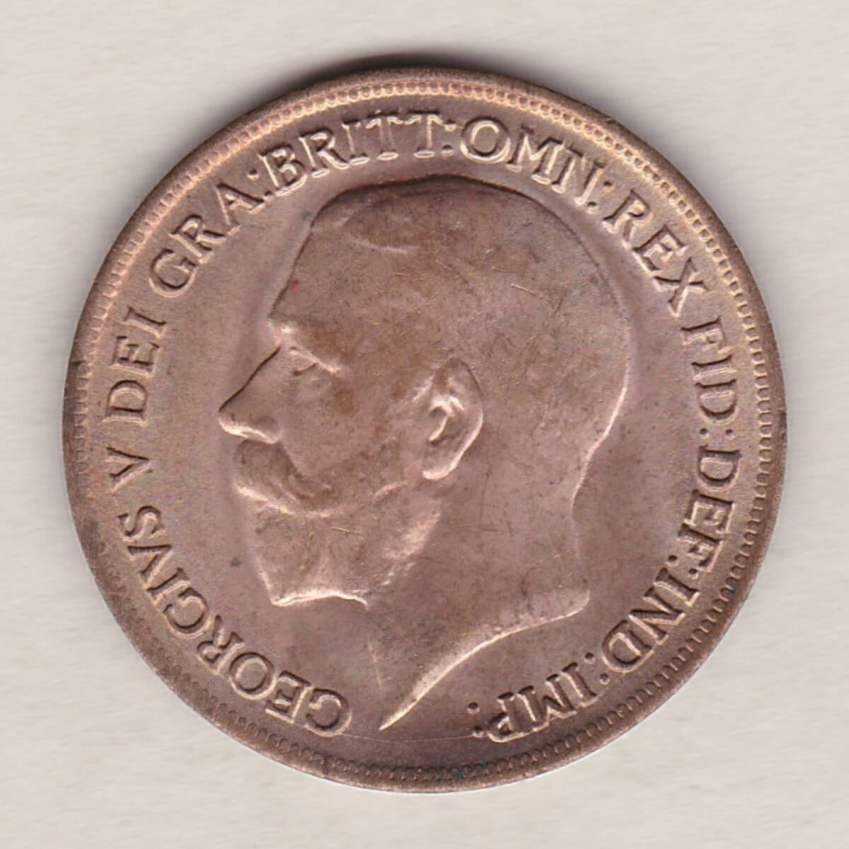 The 1919 penny was struck in bronze by the Royal Mint. The obverse side of the coin depicts the uncrowned portrait of King George V facing left, with legend around. The reverse side of the coin depicts Britannia seated to the right, the denomination above, and the date in the exergue.