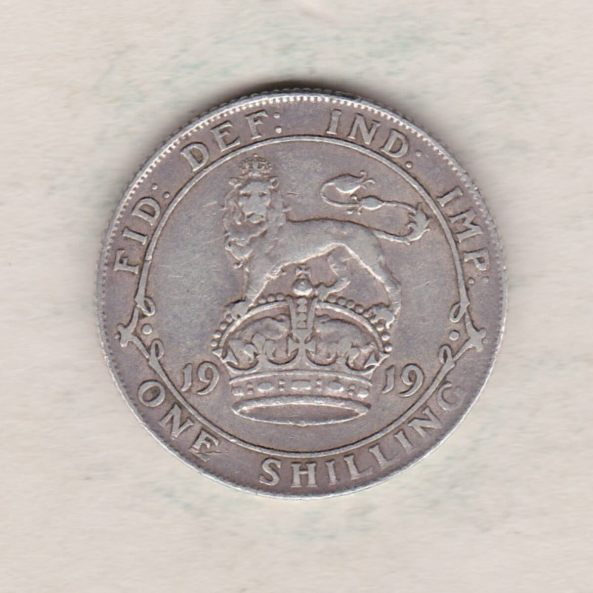 The 1919 Shilling is a coin struck in 0.925 silver by the Royal Mint. This coin features the uncrowned portrait of King George V facing left, with legend around. The reverse features a crowned lion passant atop crown dividing date, with legend above, and denomination below.