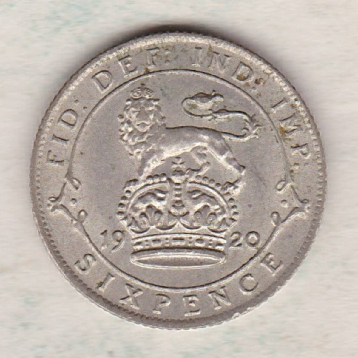The 1920 Sixpence is a coin struck in 0.500 silver by the Royal Mint.  This coin features the uncrowned portrait of King George V facing left, with legend around. The reverse features a crowned lion passant atop crown dividing date within circle, with legend above, and denomination below.