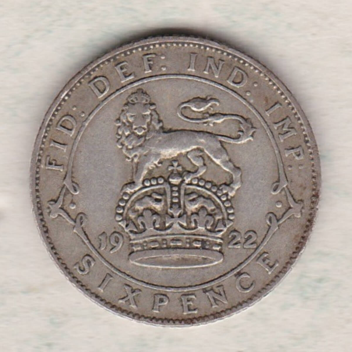 The 1922 Sixpence is a coin struck in 0.500 silver by the Royal Mint. This coin features the uncrowned portrait of King George V facing left, with legend around. The reverse features a crowned lion passant atop crown dividing date within circle, with legend above, and denomination below.