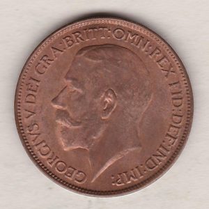 The 1923 halfpenny was struck in bronze by the Royal Mint. The obverse side of the coin depicts the uncrowned portrait of King George V facing left, with legend around. The reverse side of the coin depicts Britannia seated to the right, the denomination around, date in exergue, with sea behind.