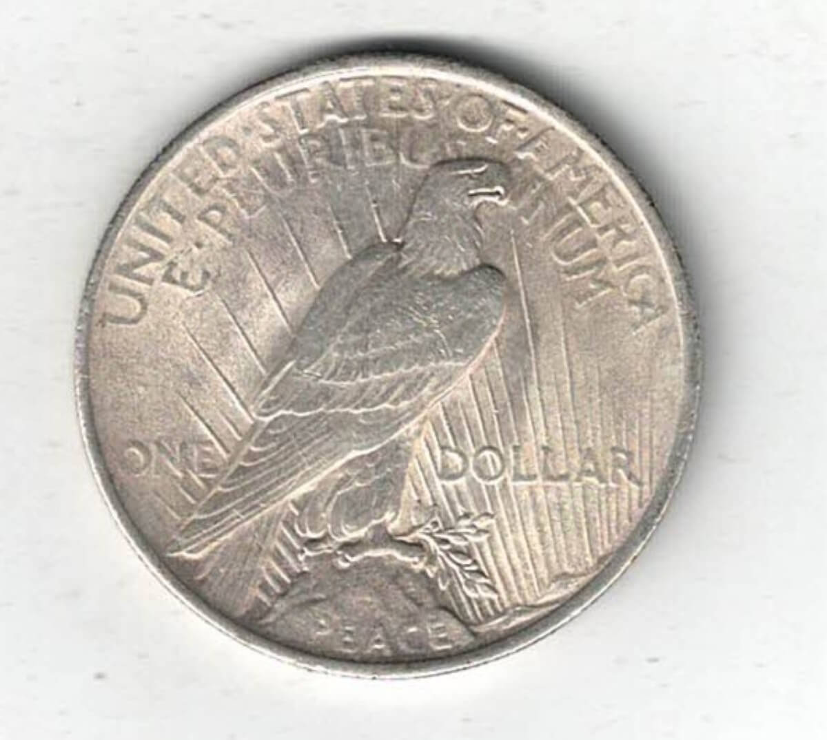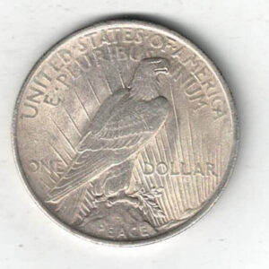 The 1923 silver dollar coin was minted in Philadelphia and is also known as the Peace Dollar. The Obverse features the capped head of Liberty facing left, wearing a headband with rays. The reverse depicts an eagle standing on a rock, wings folded, seen from the back, branch in talons, rays behind, PEACE below.