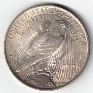The 1923 silver dollar coin was minted in Philadelphia and is also known as the Peace Dollar. The Obverse features the capped head of Liberty facing left, wearing a headband with rays. The reverse depicts an eagle standing on a rock, wings folded, seen from the back, branch in talons, rays behind, PEACE below.