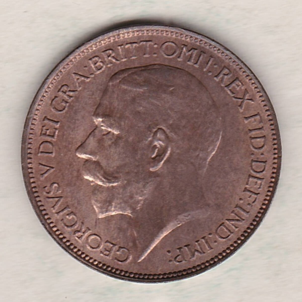 1924 Bronze Halfpenny coin featuring the portrait of King George V on the obverse. The reverse side of the coin depicts Britannia seated to the right.1924 Bronze Halfpenny – George V