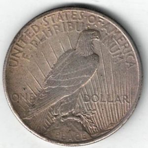 The 1924 silver dollar coin was minted in Philadelphia and is also known as the Peace Dollar. The Obverse features the capped head of Liberty facing left, wearing a headband with rays. The reverse depicts an eagle standing on a rock, wings folded, seen from the back, branch in talons, rays behind, PEACE below.