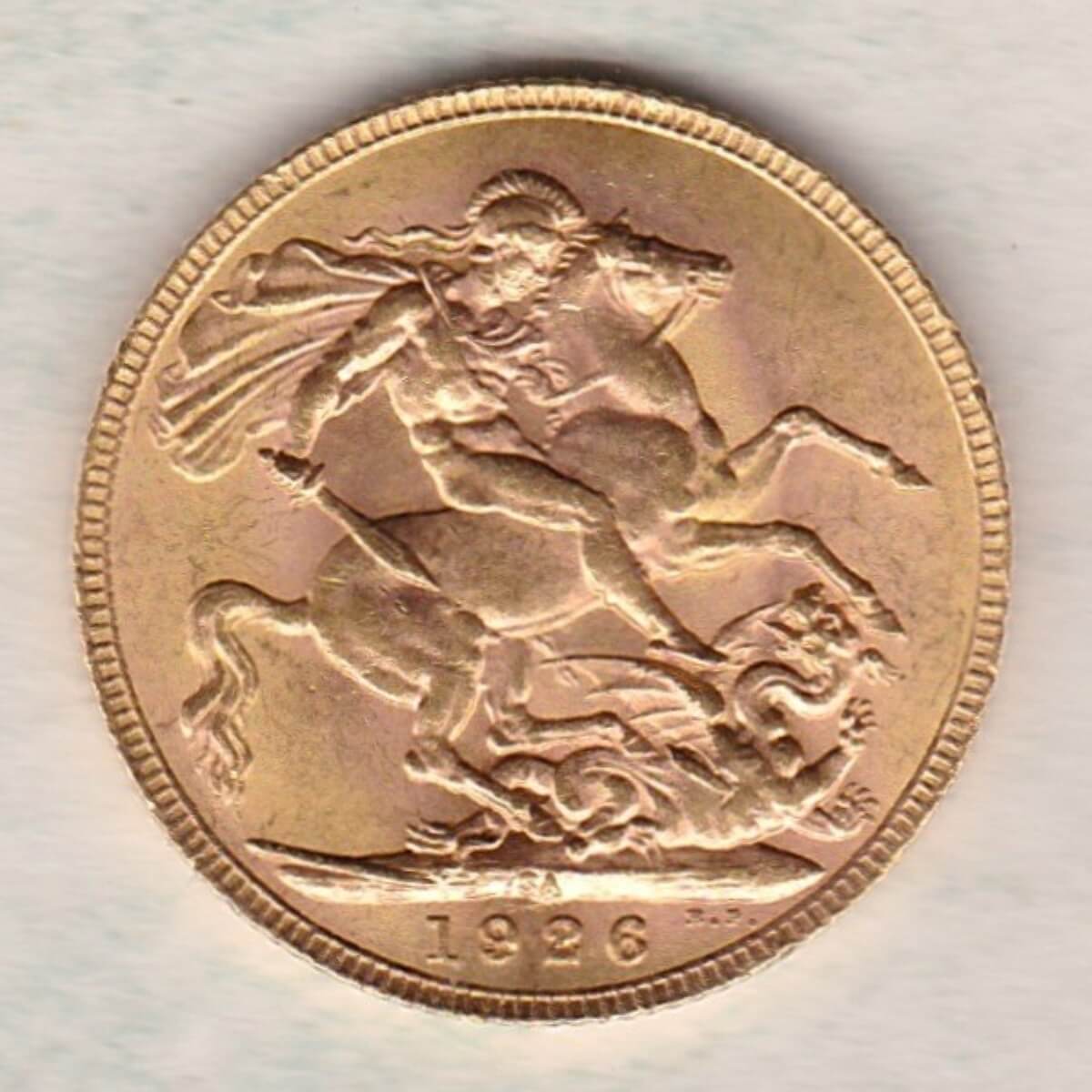 1926 SA Gold Sovereign Coin. The coin features King George V on the Obverse. St George and the dragon on the reverse. The SA Pretoria South Africa mintmark.1926 SA Gold Sovereign Coin – George V