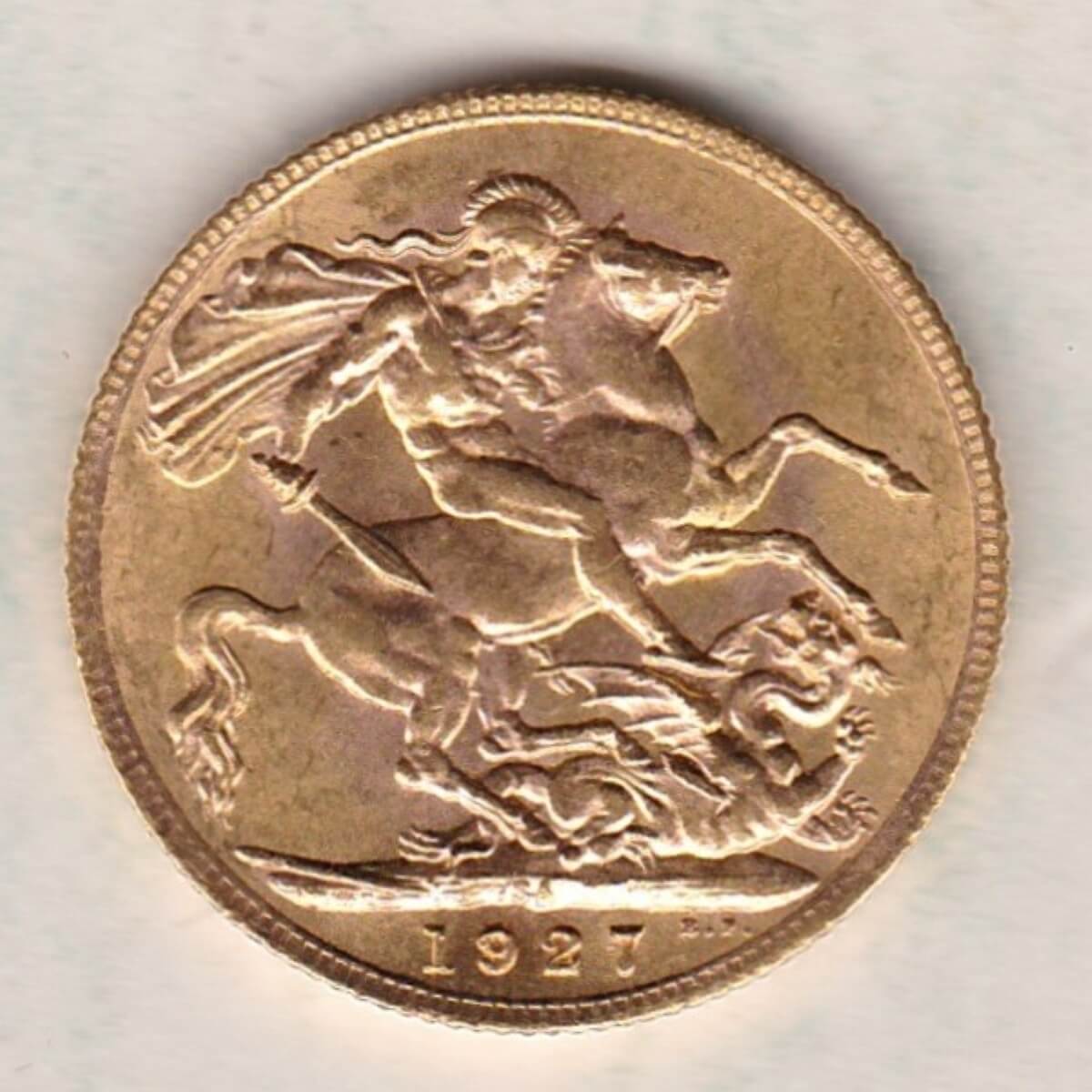 This 1927 sovereign is a coin struck in 22 carat gold in Pretoria, South Africa. The obverse of this coin features the uncrowned portrait of King George V facing left, with legend around. The reverse depicts St. George slaying the dragon, with the date and designer’s initials in exergue. The SA – Pretoria, South Africa mintmark can be seen below the horse’s hooves.