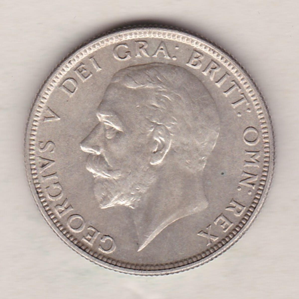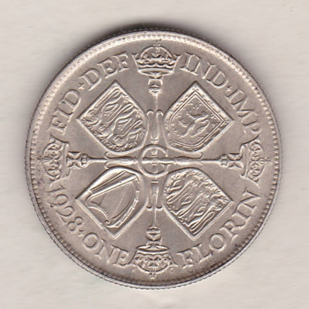 The 1928 silver Florin is a coin struck in 0.500 silver by the Royal Mint. There is an uncrowned portrait of King George V on the Obverse with legend around. The Reverse of this coin is completed by the cruciform crowned sceptres around central G, shields of England, Scotland and Ireland in angles, with legend above, date and denomination below.