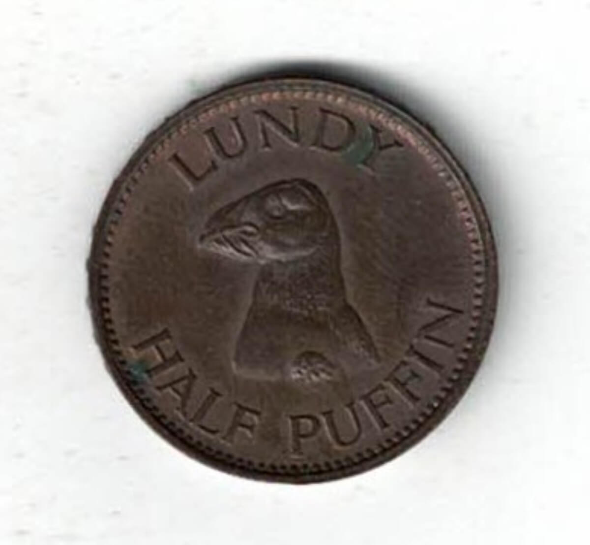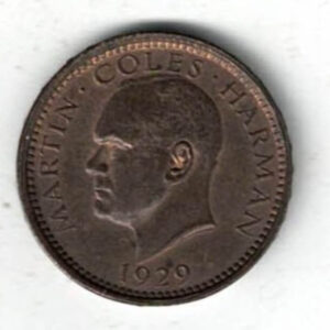 1929 Lundy Bronze Half Puffin Coin. The obverse features Martin Coles Harman, with the date 1929 below.  The reverse side of the coin features a Puffin.1929 Lundy Bronze Half Puffin Coin