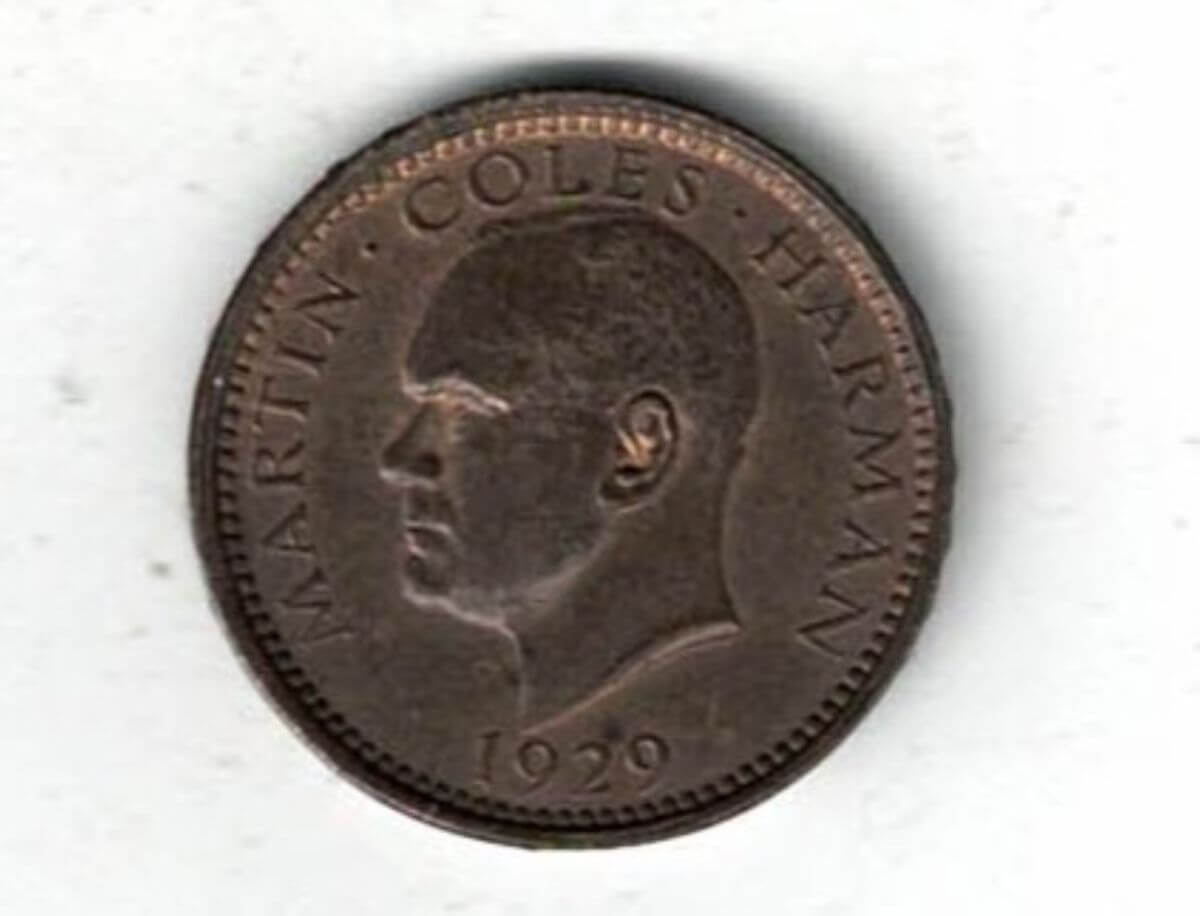 The 1929 Half Puffin was a private issue struck in bronze.  The obverse side of the coin features Martin Coles Harman, with the date 1929 below.  The reverse side of the coin features a Puffin Bird.