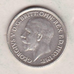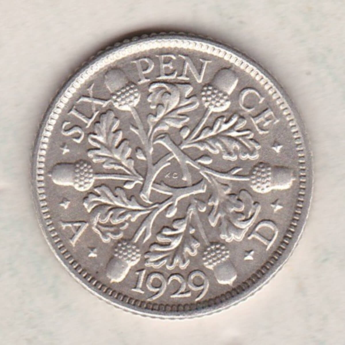 The 1929 Sixpence is a coin struck in 0.500 silver by the Royal Mint. This coin features the uncrowned portrait of King George V facing left, with legend around. The reverse features three oak sprigs with six acorns, with the denomination above, and date below.