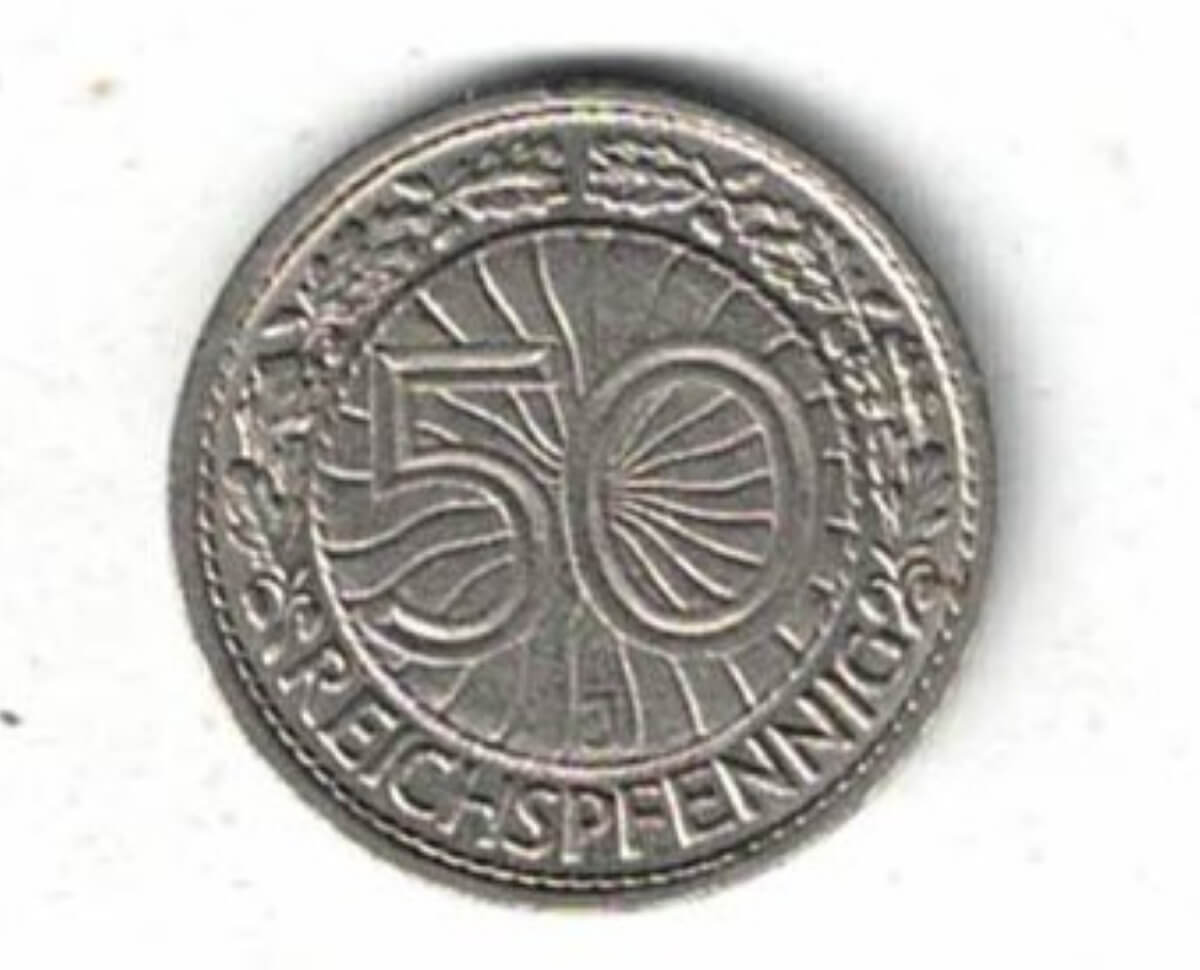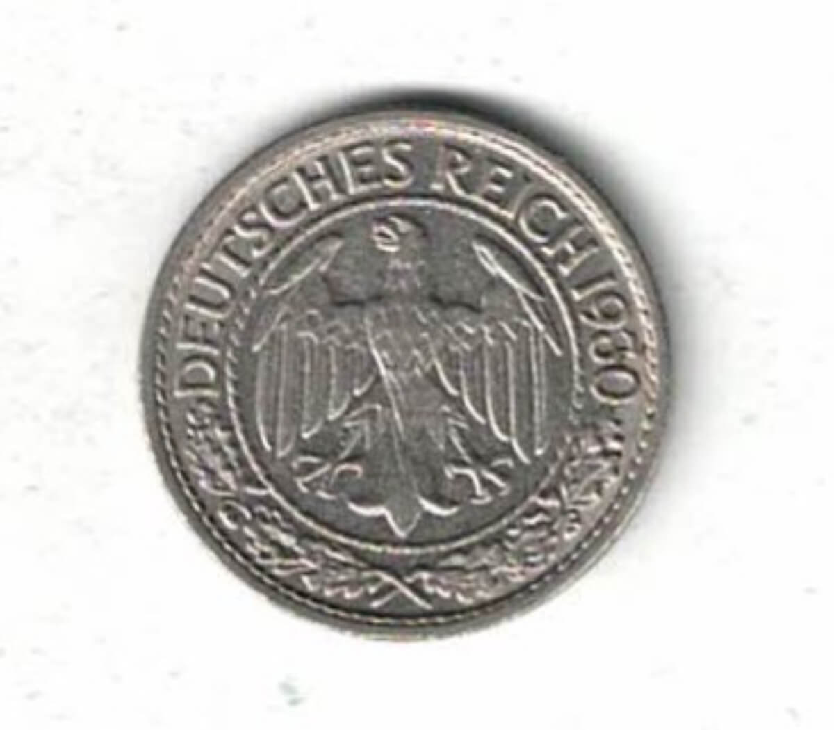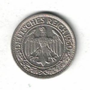 1930 J Germany Fifty Reichspfennig Coin. The obverse features an imperial eagle. The reverse features the value with oak leaves and acorns.1930 J Germany Fifty Reichspfennig Coin