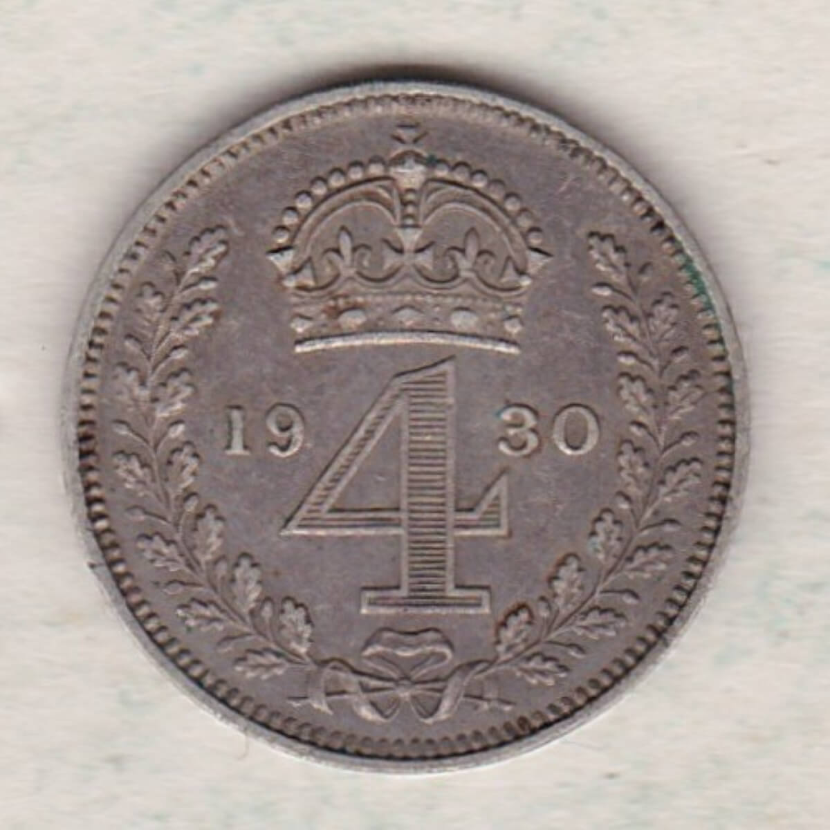 1930 silver maundy fourpence coin featuring king George V on the Obverse. The crowned denomination dividing date within an oak wreath on the Reverse.1930 Silver Maundy Fourpence – George V
