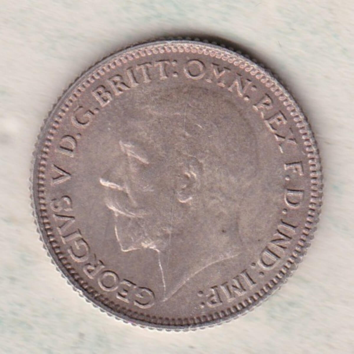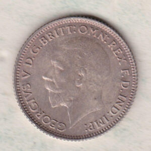 The 1930 Sixpence is a coin struck in 0.500 silver by the Royal Mint.  This coin features the uncrowned portrait of King George V facing left, with legend around. The reverse features three oak sprigs with six acorns, with the denomination above, and date below.
