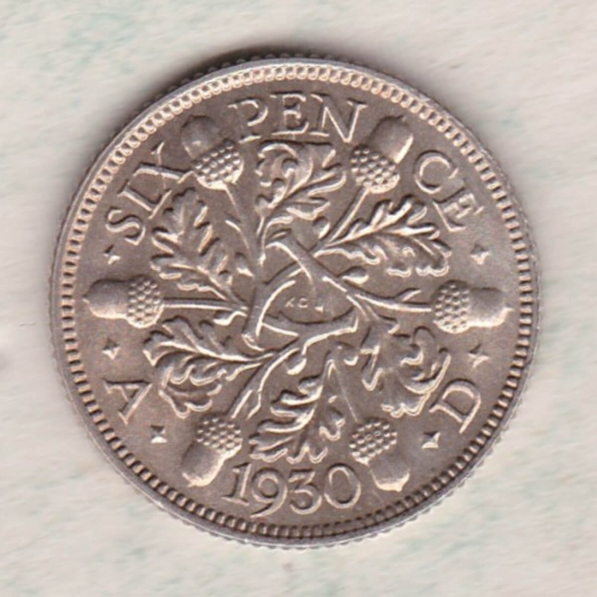 1930 Silver Sixpence coin featuring King George V on the Obverse. The Reverse features three oak sprigs with date and denomination.1930 Silver Sixpence – George V