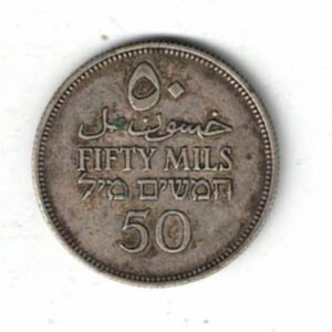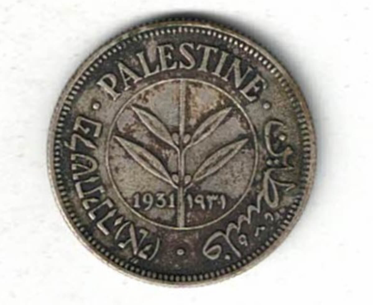 The Obverse features Palestine in Hebrew, English and Arabic around an olive branch with the date in English and Arabic on both sides of the branch. The Reverse Value in Hebrew, English and Arabic.