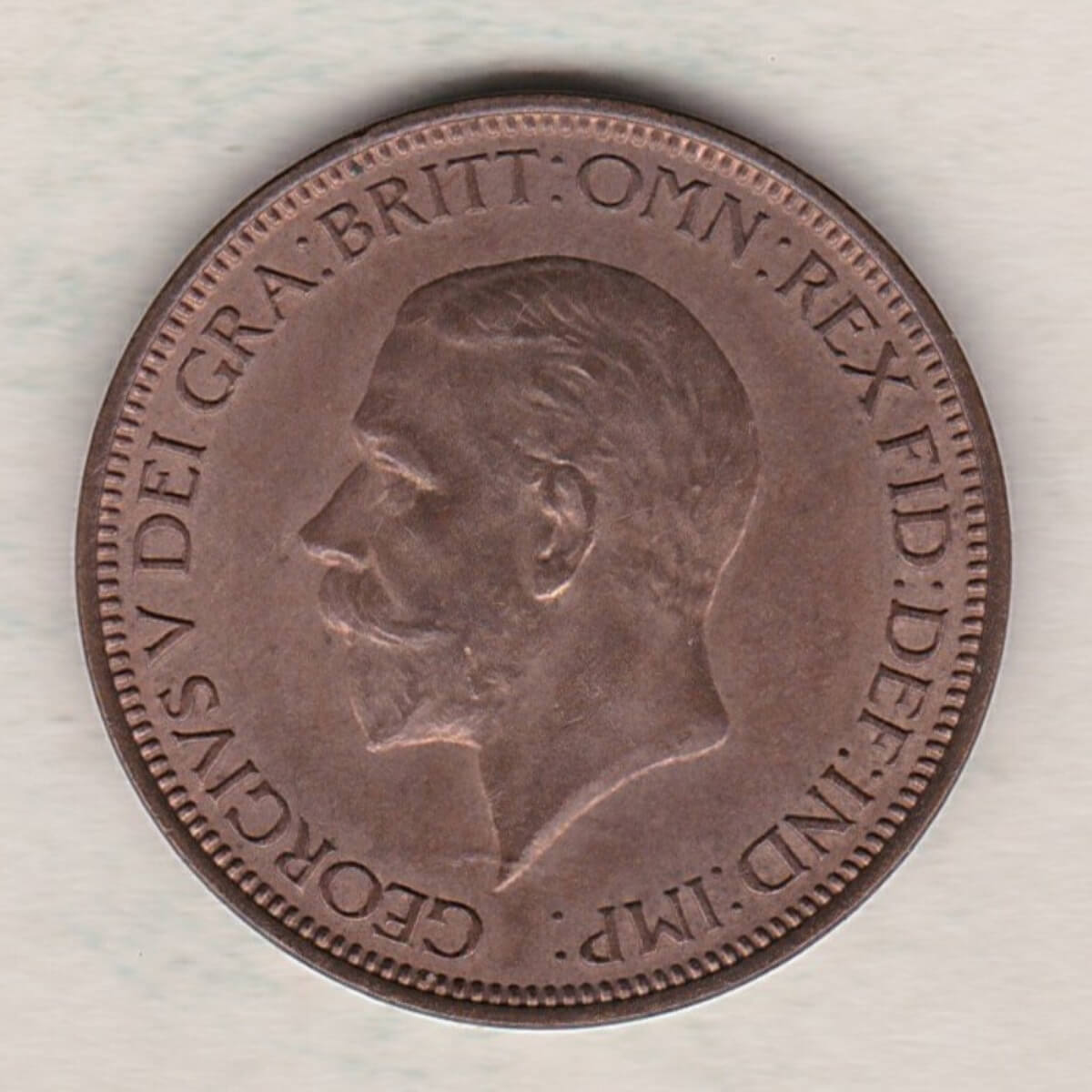 1934 Bronze Halfpenny coin featuring the portrait of King George V on the obverse. The reverse side of the coin depicts Britannia seated to the right.1934 Bronze Halfpenny – George V