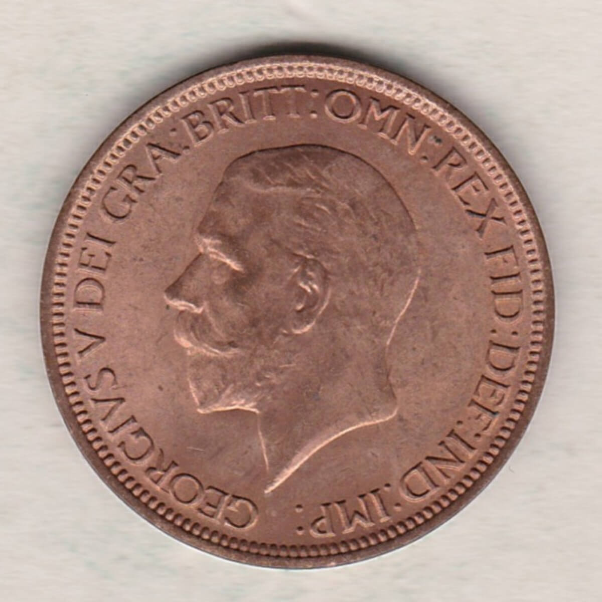 The 1935 halfpenny was struck in bronze by the Royal Mint. The obverse side of the coin depicts the uncrowned portrait of King George V facing left, with legend around. The reverse side of the coin depicts Britannia seated to the right, the denomination around, date in exergue, with sea behind.