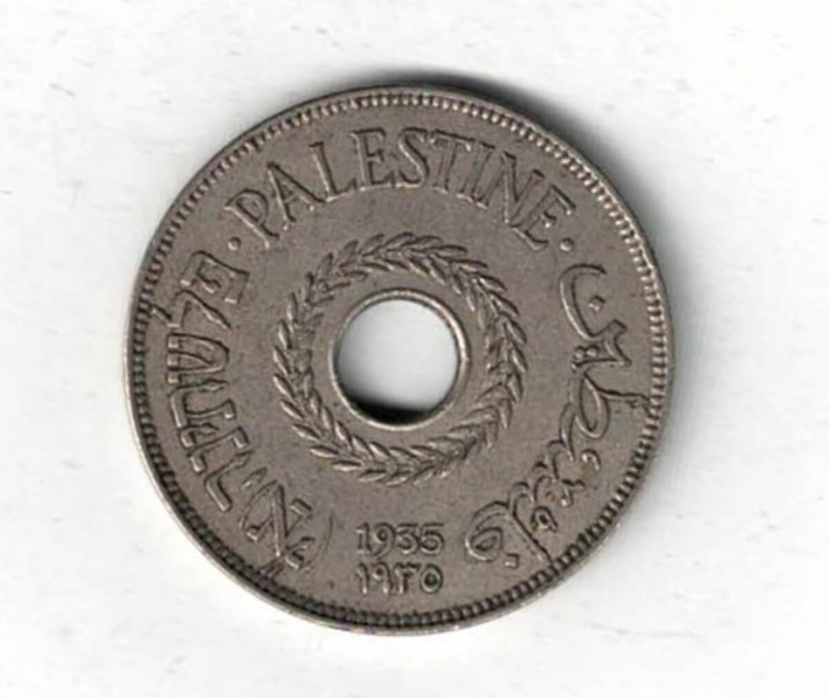 The Obverse features a Central hole encircled by an olive wreath surrounded by Palestine in Hebrew, English, and Arabic. The reverse features Value in Hebrew, English and Arabic.
