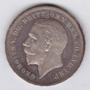 The 1935 Crown was struck in 0.500 silver and was issued to commemorate the silver Jubilee of King George V by the Royal Mint. The Obverse features the uncrowned portrait of King George V facing left, with legend around. The Reverse features an Art Deco rendering of St. George slaying the dragon, with the denomination and date above. This coin was also affectionately know as the ‘rocking horse’ crown.
