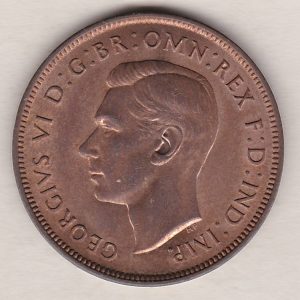 The 1937 penny was struck in bronze by the Royal Mint. The obverse side of the coin depicts the uncrowned portrait of King George VI facing left, with legend around. The reverse side of the coin depicts Britannia seated to the right, and the date is inscribed in the exergue.
