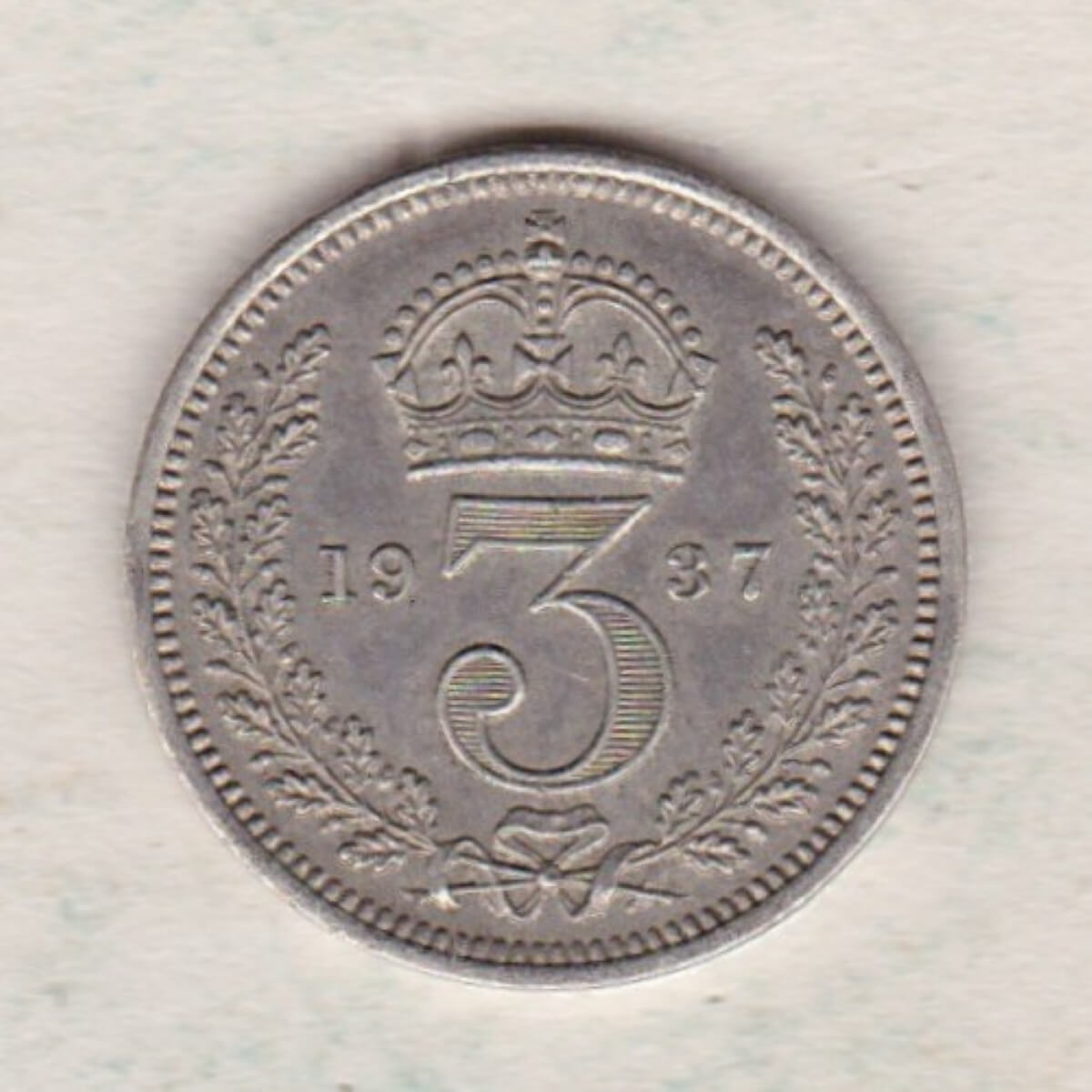 The 1937 maundy threepence is a coin struck in 0.500 silver by the Royal Mint. The Obverse features the uncrowned portrait of King George VI facing left, with legend around. The reverse features a crowned denomination dividing date within an oak wreath.