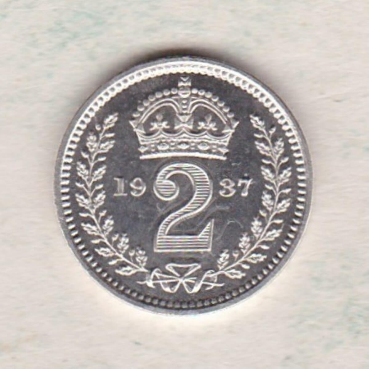 The 1937 maundy twopence is a coin struck in 0.500 silver by the Royal Mint. The Obverse features the uncrowned portrait of King George VI facing left, with legend around. The reverse features a crowned denomination dividing date within an oak wreath.