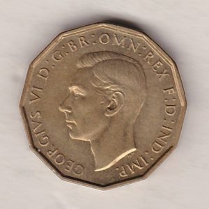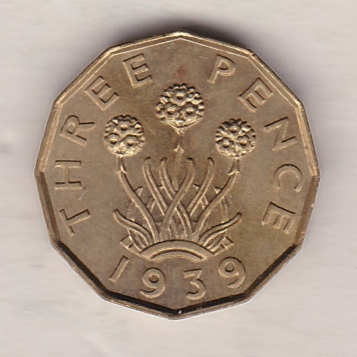 The 1939 Threepence is a coin struck in Brass by the Royal Mint. There is an uncrowned portrait of King George VI facing left with legend around on the Obverse. The Reverse features a Three-headed ‘thrift’ plant with the denomination above and date below.