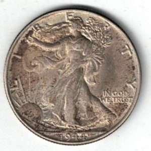 1944 USA Walking Liberty Silver Half Dollar Coin. The obverse features walking Liberty with date below. The reverse features an eagle with value below.1944 USA Walking Liberty Silver Half Dollar Coin