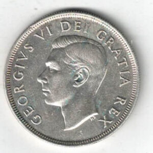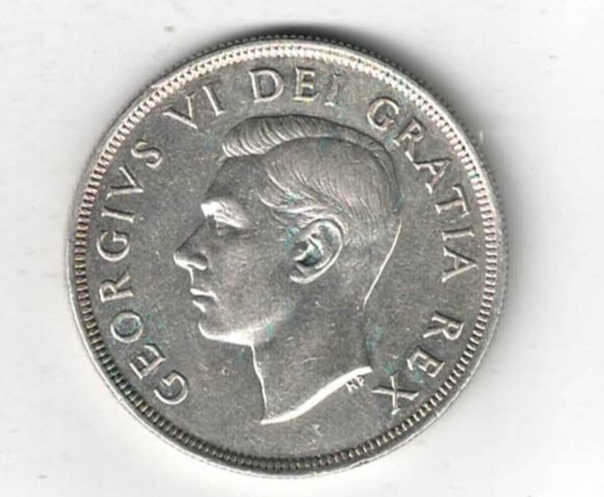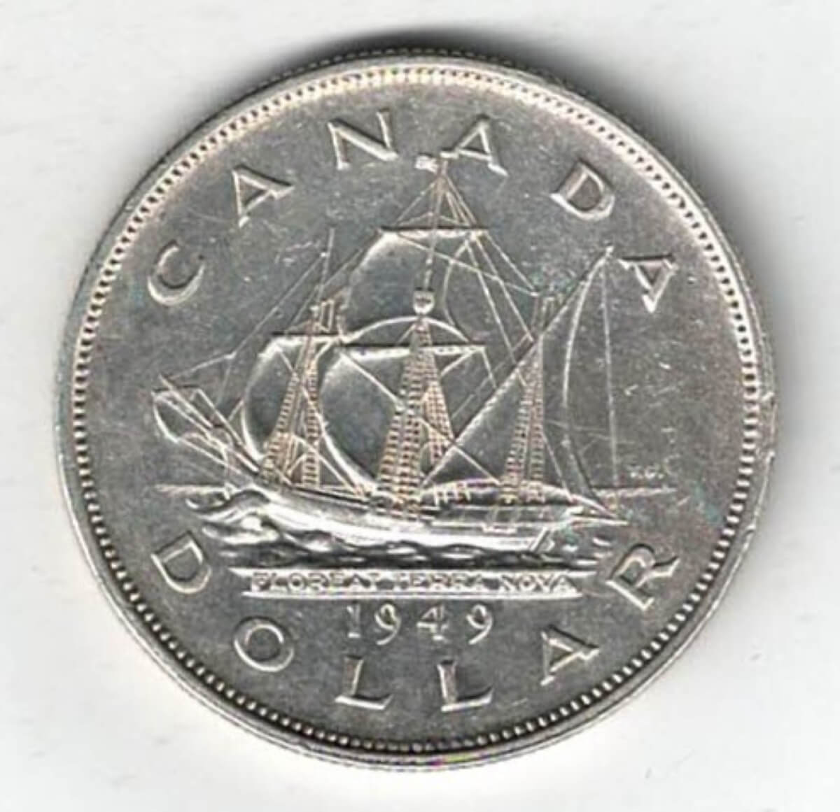 1949 Canada Silver One Dollar Coin. The obverse side of the coin features George VI facing left. The reverse features a ship sailing.1949 Canada Silver One Dollar Coin