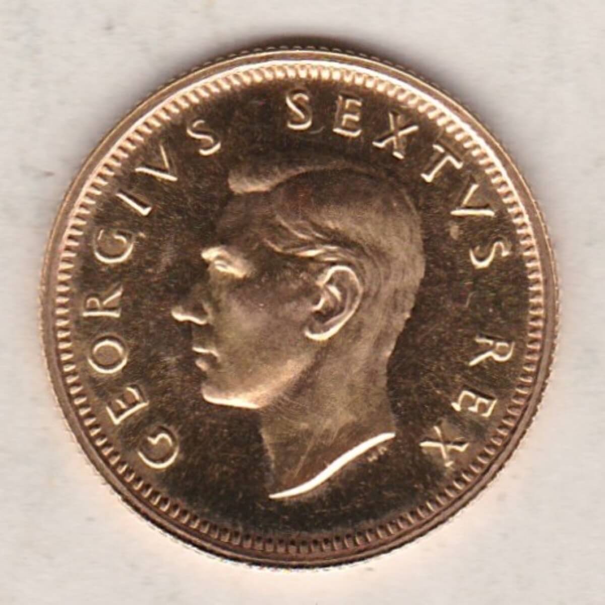 The 1952 Half Pond was struck in 22 carat gold by the South Africa Mint in Pretoria. The obverse of this proof coin features the uncrowned portrait of King George VI facing left, with legend around. The reverse is completed with a springbok at the centre, with legend around, date above, and denomination below.