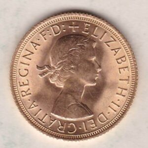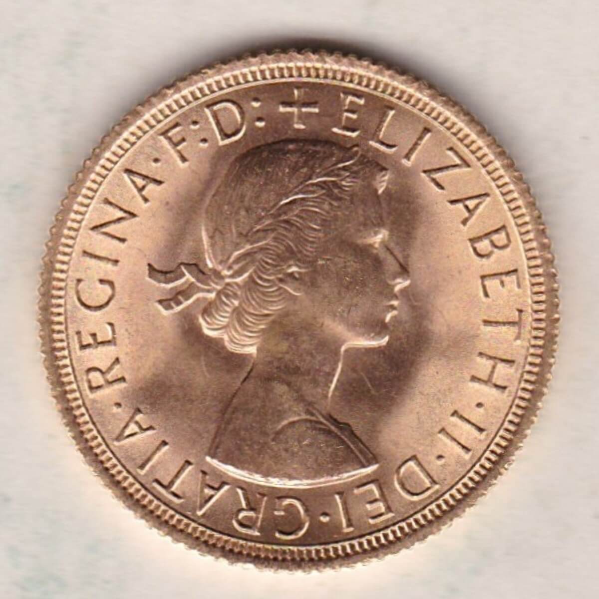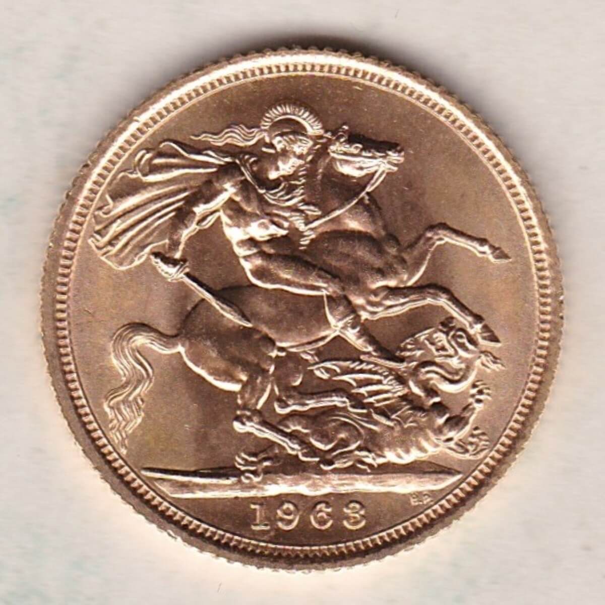 The 1963 gold sovereign coin features the first definitive portrait of Queen Elizabeth II by Mark Gillick. This design was used on the Obverse of the sovereign from 1957 to 1968, it is a young laureate head of Queen Elizabeth II facing right with legend around . The Reverse is completed with Saint George slaying the dragon right, with the date below in the exergue.
