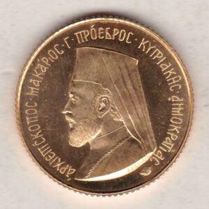 This Cyprus gold coin was struck in 0.9167 gold. The obverse of this coin features the bust of the Archbishop facing left and wearing clerical heed-dress dignitary’s veil. The reverse features the crowned Bicephalous (double-headed) eagle and the date.