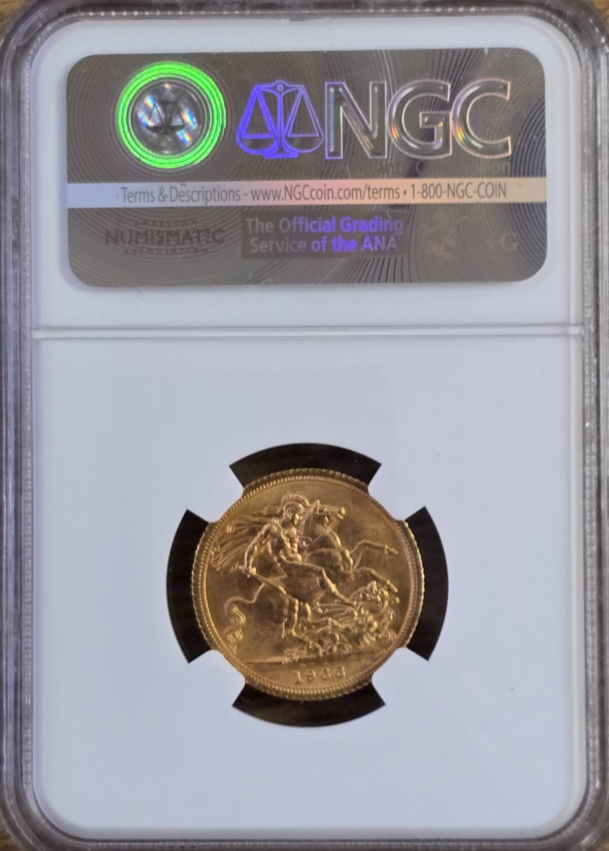 The 1966 gold sovereign coin features the first definitive portrait of Queen Elizabeth II by Mark Gillick. This design was used on the Obverse of the sovereign from 1957 to 1968, it is a young laureate head of Queen Elizabeth II facing right with legend around . The Reverse is completed with Saint George slaying the dragon right, with the date below in the exergue.