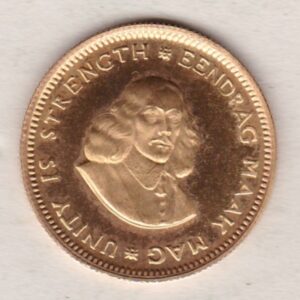 The 1970 One Rand was struck in Pretoria, South Africa Mint. The obverse features the portrait of Jan van Riebeeck, with a bilingual inscription. The reverse features a springbok above the denomination.