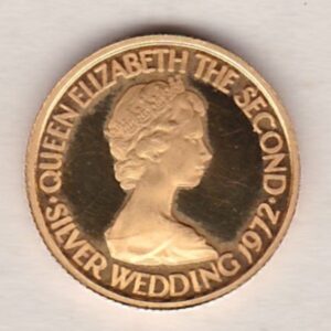 The Jersey Five Pounds was struck in 0.917 gold. This coin features the second portrait of Queen Elizabeth II facing right on the obverse. The reverse depicts a shrew, with value below. The coin was issued to commemorate the 25th anniversary of the wedding of Queen Elizabeth II and Prince Philip.