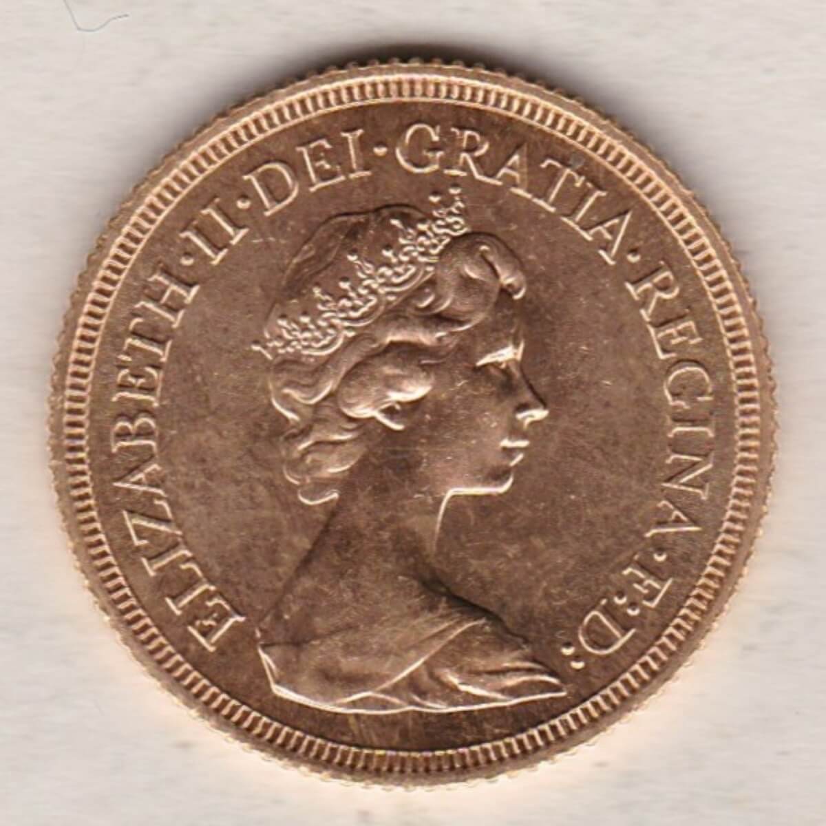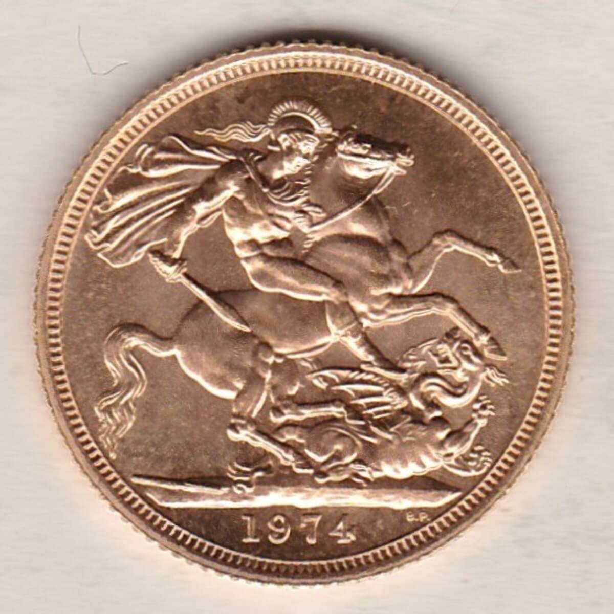 The 1974 sovereign is a coin struck in 22 carat gold by the Royal Mint. The obverse of this coin features the second crowned portrait of HM Queen Elizabeth II facing right. The Queen is wearing the Girls of Great Britain and Ireland tiara, with legend around. The reverse depicts St. George slaying the dragon, with the date and designer’s initials in exergue.