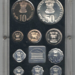 There are ten coins in this set which consists of a fifty rupee, ten rupee, one rupee, fifty paise, twenty five paise, ten paise, five paise, three paise, two paise and one paisa. This set always contains a medal.
