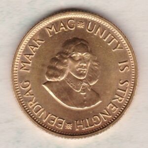 The 1974 Two Rand was struck in Pretoria, South Africa Mint. The obverse features the portrait of Jan van Riebeeck, with a bilingual inscription. The reverse features a springbok above the denomination.