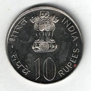 The 1975 Ten Rupee is a coin was struck in copper nickel. The obverse side of this coin features Ashoka lion capitol with value. The reverse features a female looking right.