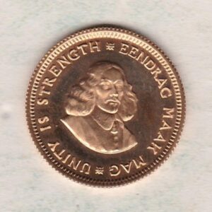 The 1978 One Rand was struck in Pretoria, South Africa Mint. The obverse features the portrait of Jan van Riebeeck, with a bilingual inscription. The reverse features a springbok above the denomination.
