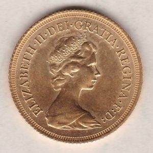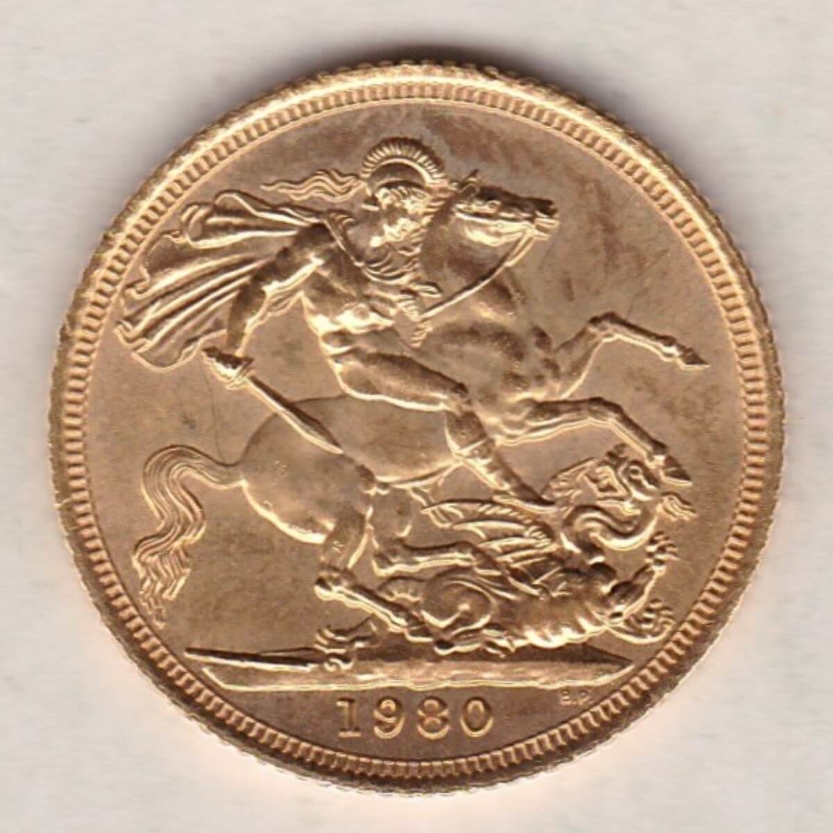 The 1980 sovereign is a coin struck in 22 carat gold by the Royal Mint. The obverse of this coin features the second crowned portrait of HM Queen Elizabeth II facing right. The Queen is wearing the Girls of Great Britain and Ireland tiara, with legend around. The reverse depicts St. George slaying the dragon, with the date and designer’s initials in exergue.
