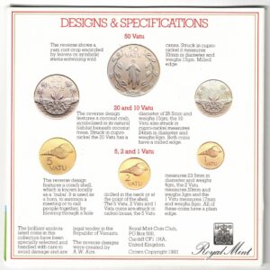 The coins in this set are, a Fifty Vatu, Twenty Vatu, Ten Vatu, Five Vatu, Two Vatu and One Vatu.
