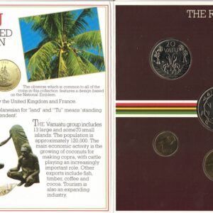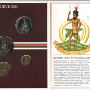 The Obverse features The arms of Vanuatu featuring a Melanesian warrior standing in front of a curved boar’s tooth above a scroll reading “LONG GOD YUMI STANAP”.