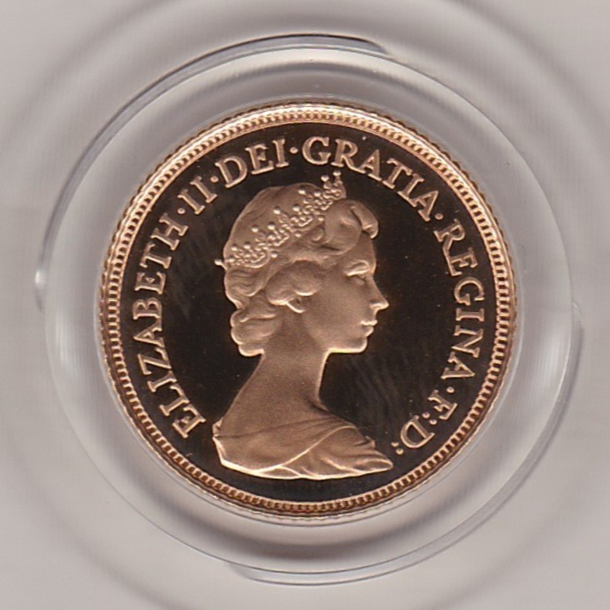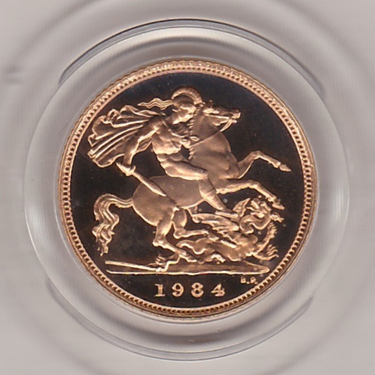 The 1984 half sovereign is a coin struck in 22 carat gold as a proof only by the Royal Mint. The Obverse features the second crowned portrait of Queen Elizabeth II facing right, wearing the Girls of Great Britain and Ireland tiara, with legend around.. The Reverse features St. George slaying the dragon right, with date and designer’s initials in exergue.