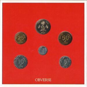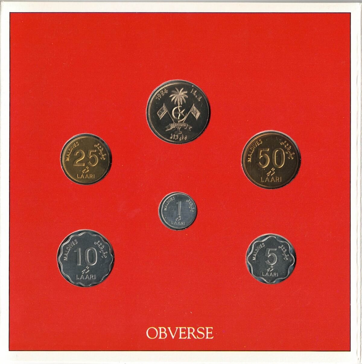 The coins in this set consists of a 50 Laari, 25 Laari, 10 Laari, 5 Laari, 1 Laari and 1 Rufiyaa.