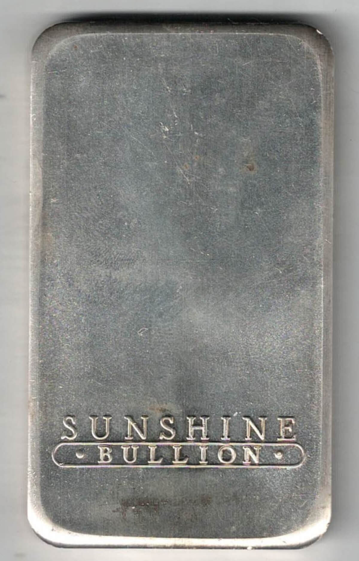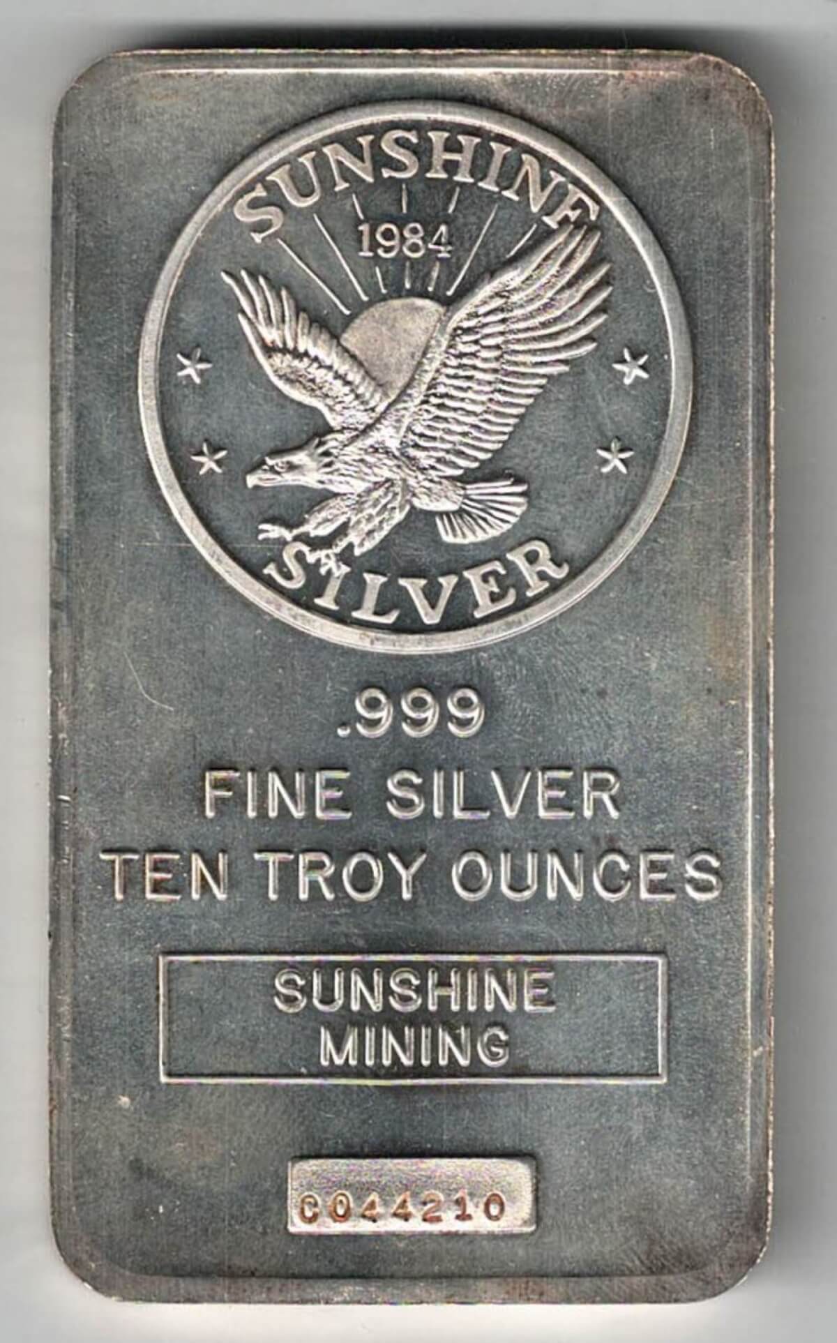 Sunshine Mining Ten Ounce Silver Bar. This bar contains 10 ounces of 999 fine Silver. All of our silver bars have been pre-owned and are in stock.1984 Sunshine Mining Ten Ounce Silver Bar