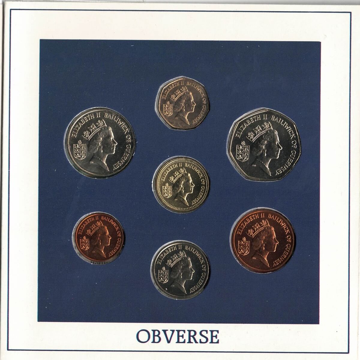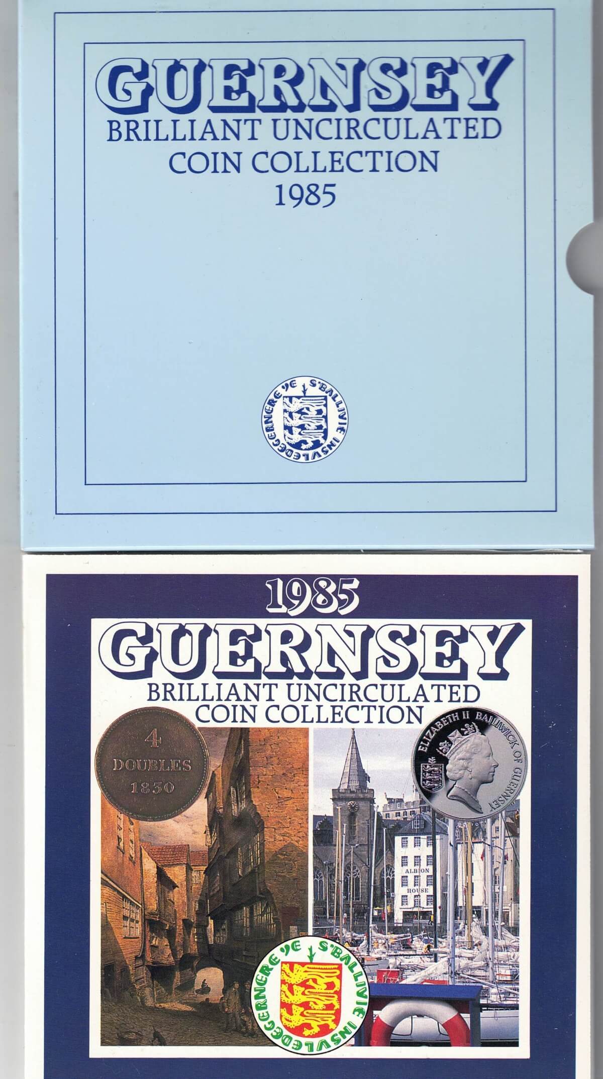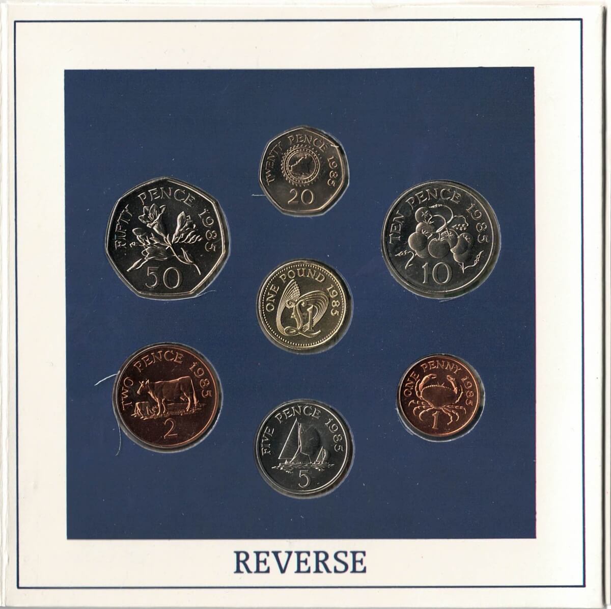 1985 Guernsey Brilliant Uncirculated Seven Coin Collection In Near Mint Condition.