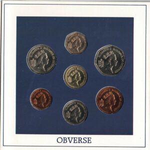 The coins in this set consists of a one pound, fifty pence, twenty pence, ten pence, five pence, two pence and one penny.