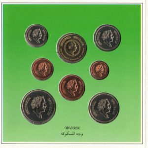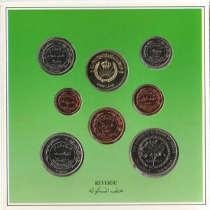The coins in this set consists of a 1 Dinar, 250 Fils, 100 Fils, 50 Fils, 25 Fils, 10 Fils, 5 fils and 1 Fil.